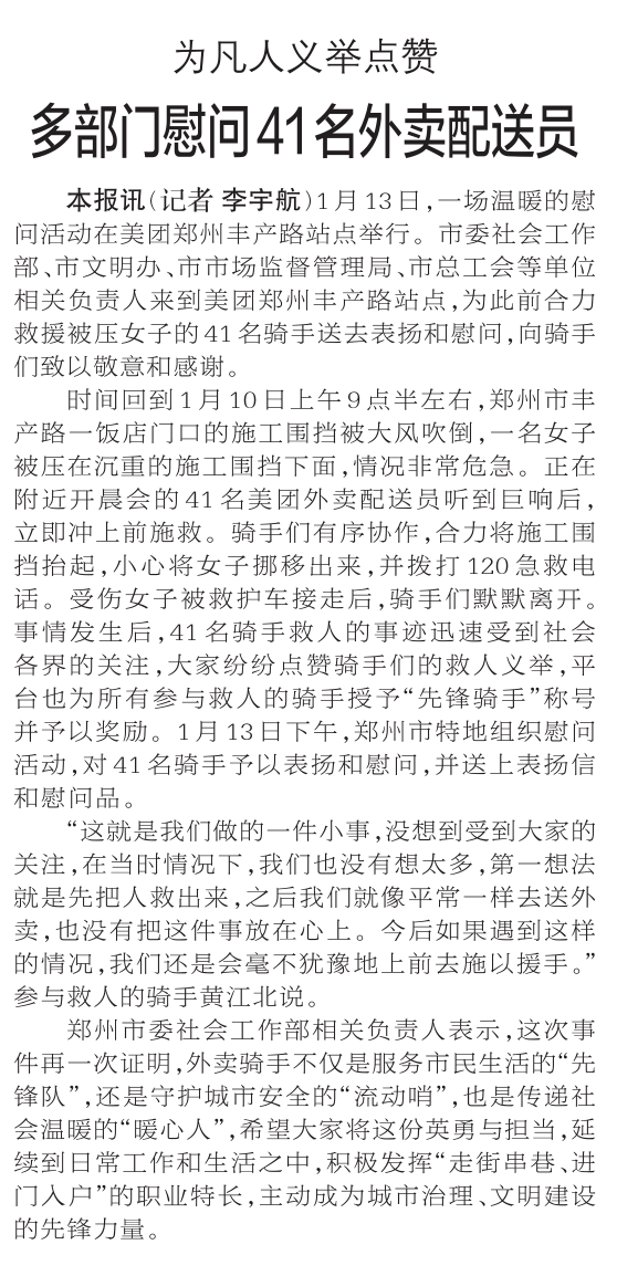 1月13日,一场温暖的慰问活动在美团郑州丰产路站点举行。市委社会工作部、市文明办、市市场监督管理局、市总工会等单位相关负责人来到美团郑州丰产路站点,为此前合力救援被压女子的41名骑手送去表扬和慰问,向骑手们致以敬意和感谢。(今日《郑州日报》2版)