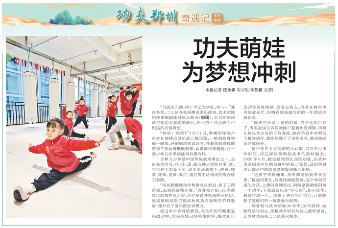“习武先习德,哼!学艺先学礼,哈……”寒冷冬季,二七区齐礼阎搏击俱乐部里,功夫萌娃们挥拳踢腿练得热火朝天,全力冲刺河南卫视功夫春晚的舞台,用一招一式点燃心中炽热的武侠梦想。(今日《郑州日报》5版)