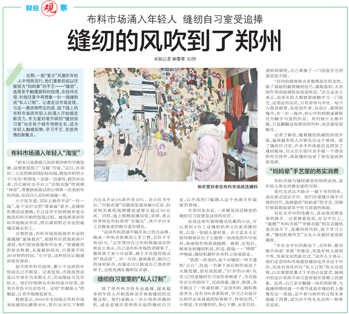 近期,一股“复古”风潮在年轻人中悄然流行,他们重新拾起以往被视为“妈妈辈”的手艺——“缝纫”,选择亲手触摸面料的纹理,在经纬交错、针线往复中将想象一针一线缝制成“私人订制”。记者走访市场发现,与这一潮流相呼应的是,线下线上的布料市场因年轻人的涌入开始焕发新活力,专为爱好者开辟的“缝纫自习室”也在各个城市悄然生长,成为年轻人触碰织物、学习手艺、安放热情的新聚点。(今日《郑州日报》6版)