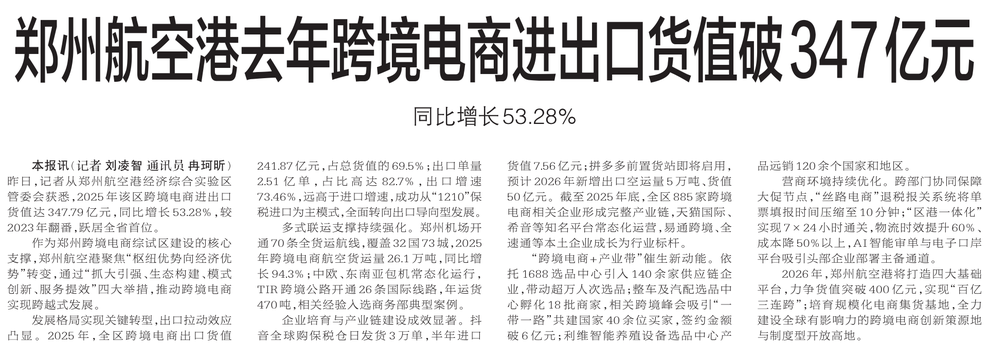 昨日,记者从郑州航空港经济综合实验区管委会获悉,2025年该区跨境电商进出口货值达347.79亿元,同比增长53.28%,较2023年翻番,跃居全省首位。