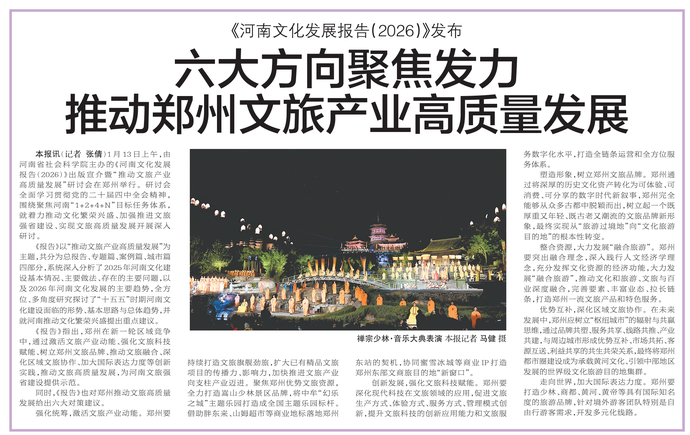 1月13日上午,由河南省社会科学院主办的《河南文化发展报告(2026)》出版宣介暨“推动文旅产业高质量发展”研讨会在郑州举行。研讨会全面学习贯彻党的二十届四中全会精神,围绕聚焦河南“1+2+4+N”目标任务体系,就着力推动文化繁荣兴盛、加强推进文旅强省建设、实现文旅高质量发展开展深入研讨。(今日《郑州日报》8版)