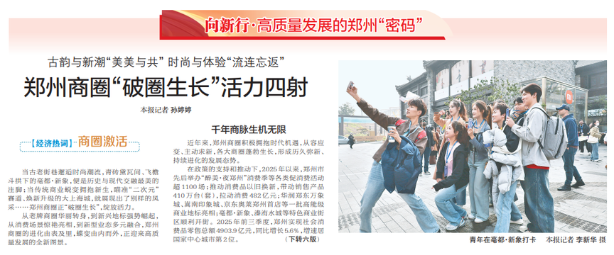 当古老街巷邂逅时尚潮流,青砖黛瓦间、飞檐斗拱下的亳都·新象,便是历史与现代交融最美的注脚;当传统商业蜕变拥抱新生,瞄准“二次元”赛道、焕新升级的大上海城,就展现出了别样的风采……郑州商圈正“破圈生长”,绽放活力。(今日《郑州日报》1版、6版)