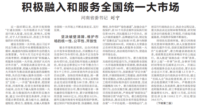 近一段时期以来,经济日报围绕“打通全国统一大市场堵点卡点”问题进行深入报道,站位高,影响大,反响好,对于人们加深认识、改进工作有很强的针对性和指导性。(今日《河南日报》1版、2版)