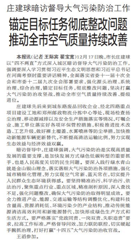 12月17日晚,市长庄建球以“四不两直”方式深入城区暗访督导大气污染防治工作,强调要深入学习贯彻习近平生态文明思想和习近平总书记在河南考察时重要讲话精神,全面落实省委十一届十次全会和市委十二届九次全会部署要求,强化源头治理、系统治理、综合治理,锚定目标任务,彻底整改问题,坚决打赢大气污染防治攻坚战,推动全市空气质量持续改善、提级进位。(今日《郑州日报》1版)