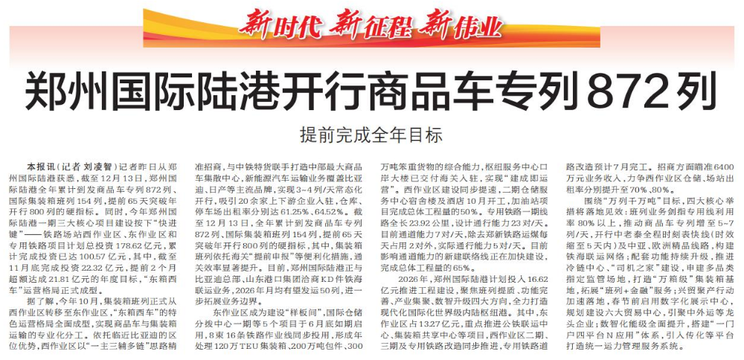 记者昨日从郑州国际陆港获悉,截至12月13日,郑州国际陆港全年累计到发商品车专列872列、国际集装箱班列154列,提前65天突破年开行800列的硬指标。同时,今年郑州国际陆港一期三大核心项目建设按下“快进键”——铁路场站西作业区、东作业区和专用铁路项目计划总投资178.62亿元,累计完成投资已达100.57亿元,其中,截至11月底完成投资22.32亿元,提前2个月超额达成21.81亿元的年度目标,“东箱西车”运营格局正式成型。(今日《郑州日报》2版)
