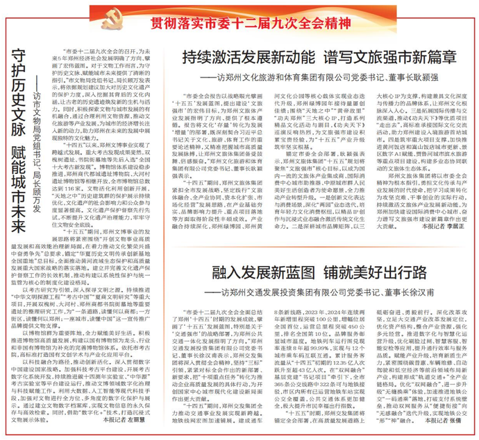 “市委十二届九次全会的召开,为未来5年郑州经济社会发展明确了方向、擘画了宏伟蓝图。对于文物工作而言,为守护历史文脉、赋能城市未来提供了清晰的指引。”市文物局党组书记、局长顾万发表示,将依据规划建议加大对历史文化遗产的保护力度,深入挖掘其背后的文化内涵,让古老的历史遗迹焕发新的生机与活力。同时,积极探索文物与城市发展的有机融合,通过合理利用文物资源,推动文化旅游等产业发展,为城市的经济增长注入新的动力,助力郑州在未来的发展中展现独特的文化魅力。(今日《郑州日报》2版)