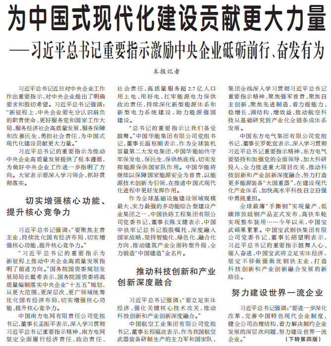 习近平总书记近日对中央企业工作作出重要指示,对中央企业提出了明确要求和殷切希望。习近平总书记强调:“新征程上,中央企业要充分认识肩负的职责使命,更好服务党和国家工作大局,服务经济社会高质量发展,服务保障和改善民生,勇担社会责任,为中国式现代化建设贡献更大力量。”(今日《人民日报》1版、4版)