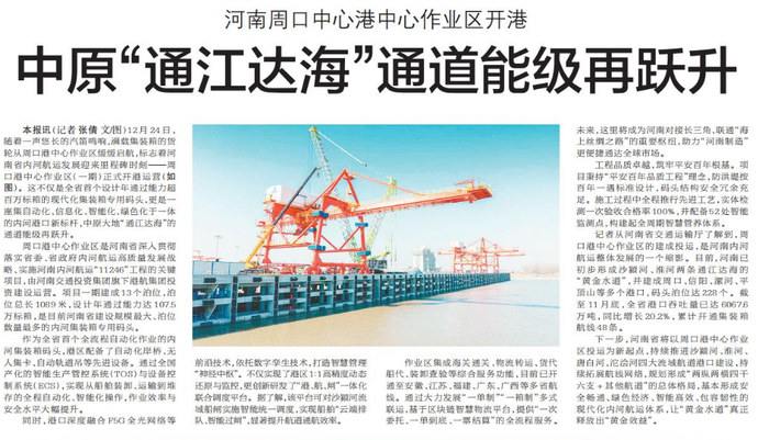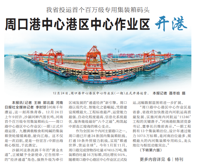 河南千年漕运,这一刻再焕青春。12月24日上午9时许,沙颍河畔汽笛长鸣,河南首个百万级专用集装箱码头——周口港中心港区中心作业区(一期)正式开港运营。九艘满载粮食和纯碱的集装箱货轮缓缓离港,驶向江海。这不仅是一次启航,更是一份宣言:中原出海核心枢纽,于此落定。(今日《河南日报》1版、6版)