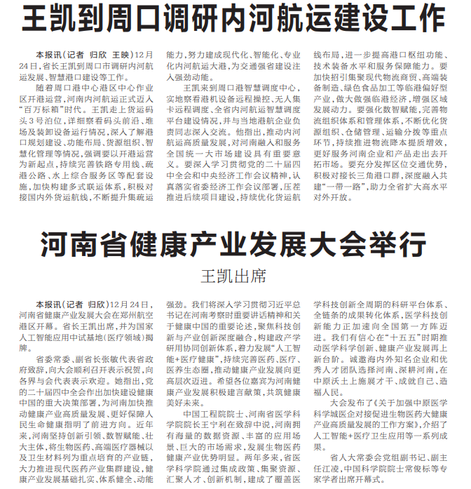 12月24日,省长王凯到周口市调研内河航运发展、智慧港口建设等工作。(今日《河南日报》1版)