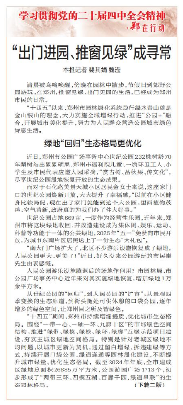 清晨被鸟鸣唤醒,傍晚在园林中散步,节假日到郊野公园游玩,在郑州,推窗见绿、出门见园的生活,已经成为郑州市民的日常。(今日《郑州日报》1版、2版)