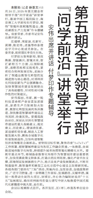 12月24日,2025年第五期全市领导干部“问学前沿”讲堂举行,邀请中国工程院院士、南京理工大学原校长付梦印,围绕“智能科技赋能制造业,推动新质生产力发展”作专题辅导。省委常委、市委书记安伟出席并讲话。(今日《郑州日报》1版)
