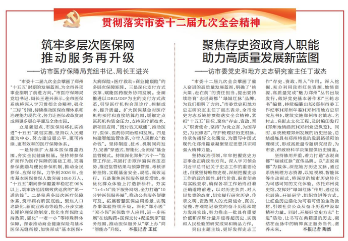 “市委十二届九次全会擘画了郑州‘十五五’时期的发展蓝图,为全市各项事业指明了前进方向。”市医疗保障局党组书记、局长王进兴表示,全市医保系统将深入学习贯彻全会精神,强化“三标”引领,持续推动医保治理体系和治理能力现代化,努力让医保改革发展成果更多更公平惠及全体市民。(今日《郑州日报》2版)
