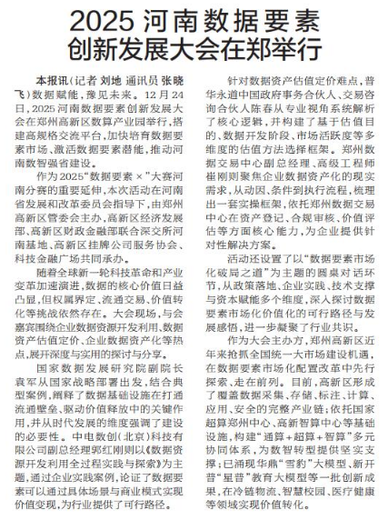 数据赋能,豫见未来。12月24日,2025河南数据要素创新发展大会在郑州高新区数算产业园举行,搭建高规格交流平台,加快培育数据要素市场、激活数据要素潜能,推动河南数智强省建设。(今日《郑州日报》2版)