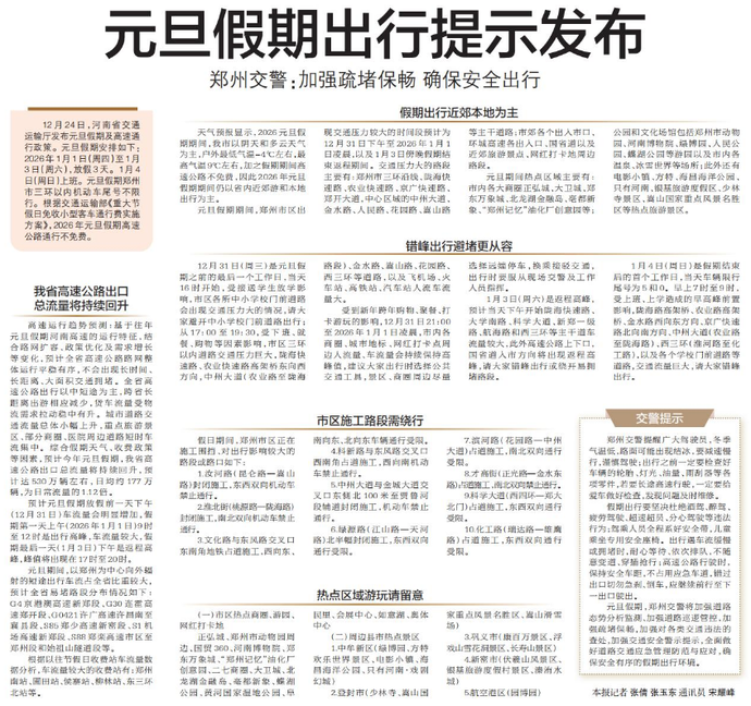 12月24日,河南省交通运输厅发布元旦假期及高速通行政策。元旦假期安排如下:2026年1月1日(周四)至1月3日(周六),放假3天。1月4日(周日)上班。元旦假期郑州市三环以内机动车尾号不限行。根据交通运输部《重大节假日免收小型客车通行费实施方案》,2026年元旦假期高速公路通行不免费。(今日《郑州日报》5版)