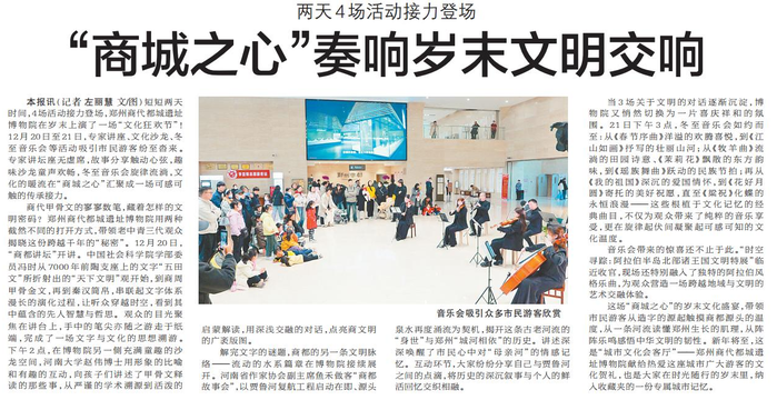 短短两天时间,4场活动接力登场,郑州商代都城遗址博物院在岁末上演了一场“文化狂欢节”!12月20日至21日,专家讲座、文化沙龙、冬至音乐会等活动吸引市民游客纷至沓来。专家讲坛座无虚席,故事分享触动心弦,趣味沙龙童声欢畅,冬至音乐会旋律流淌,文化的暖流在“商城之心”汇聚成一场可感可触的传承接力。(今日《郑州日报》8版)