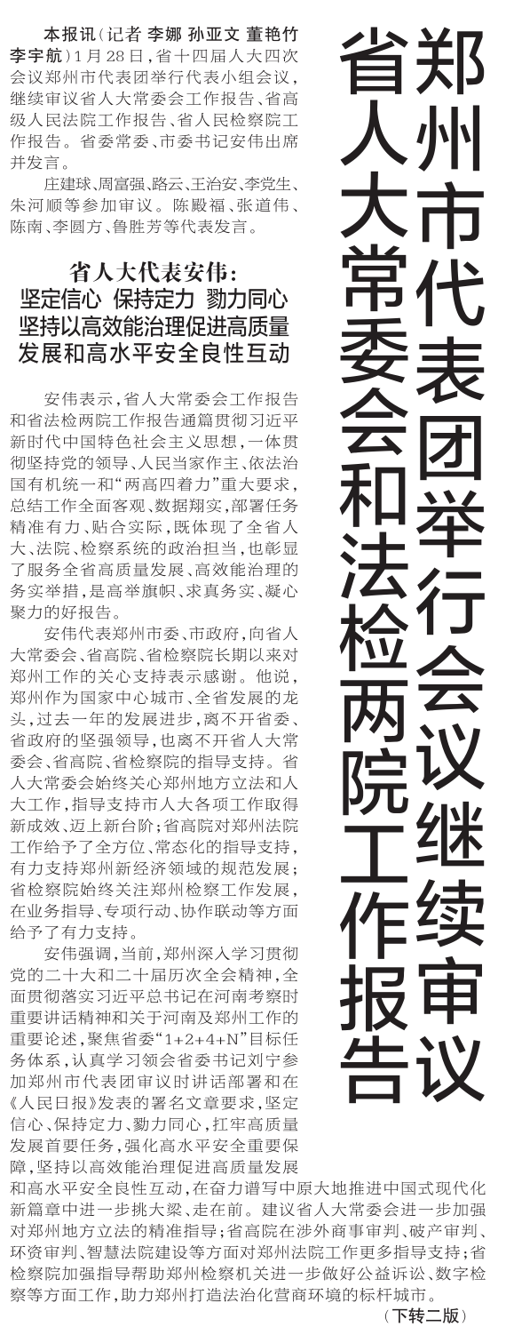 1月28日,省十四届人大四次会议郑州市代表团举行代表小组会议,继续审议省人大常委会工作报告、省高级人民法院工作报告、省人民检察院工作报告。省委常委、市委书记安伟出席并发言。(今日《郑州日报》1版、2版)