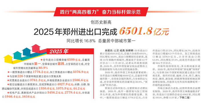 全市进出口累计完成6501.8亿元,总量占全省的69.5%,同比增长16.8%,进出口规模创历史新高,连续14年领跑中部城市,增速高于全国13个百分点……1月28日,记者从市商务局获悉,2025年,全市外贸发展呈现出逆势而上的强劲韧性与亮点纷呈的发展态势。(今日《郑州日报》1版、2版)