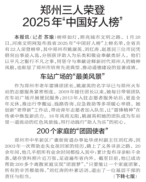 榜样如灯,照亮城市文明之路。1月28日,河南文明网发布我省2025年“中国好人榜”上榜名单,全省共有22人荣登榜单,其中郑州市姚淑英、刘红涛、赵恩民三位市民凭借突出事迹入选,分别获评助人为乐类和敬业奉献类好人。他们以平凡之躯行不凡之事,用坚守与奉献诠释新时代郑州人的精神风貌,也彰显了郑州市培育先进典型、推动道德建设的显著成效。(今日《郑州日报》1版、7版)