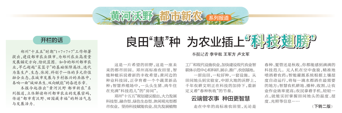 本报今起推出“黄河沃野 都市新农 ”系列报道,立体解读郑州都市农业的发展密码,传递“都市有沃野、田园藏幸福”的鲜活气息与发展活力。
