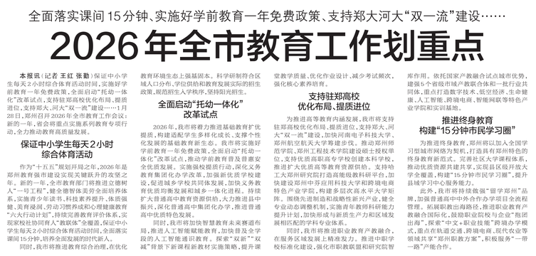 保证中小学生每天2小时综合体育活动时间,实施好学前教育一年免费政策,全面启动“托幼一体化”改革试点,支持驻郑高校优化布局、提质进位,支持郑大、河大“双一流”建设……1月28日,郑州召开2026年全市教育工作会议:新的一年,省会将重点实施系列教育专项行动,全力推动教育高质量发展。(今日《郑州日报》7版)