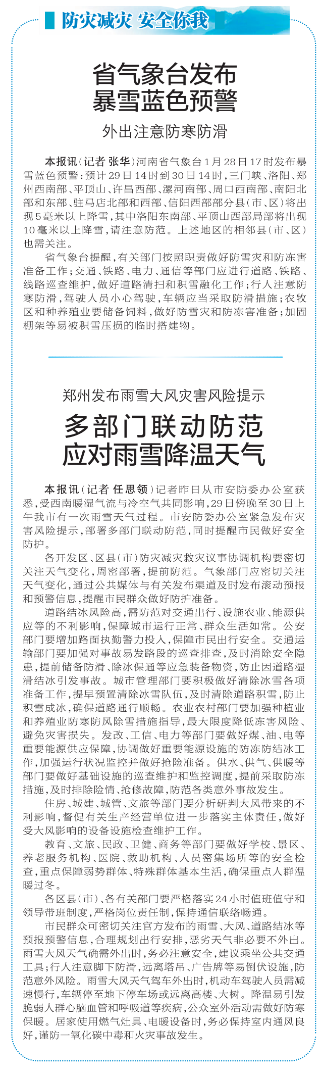 记者昨日从市安防委办公室获悉,受西南暖湿气流与冷空气共同影响,29日傍晚至30日上午我市有一次雨雪天气过程。市安防委办公室紧急发布灾害风险提示,部署多部门联动防范,同时提醒市民做好安全防护。(今日《郑州日报》8版)