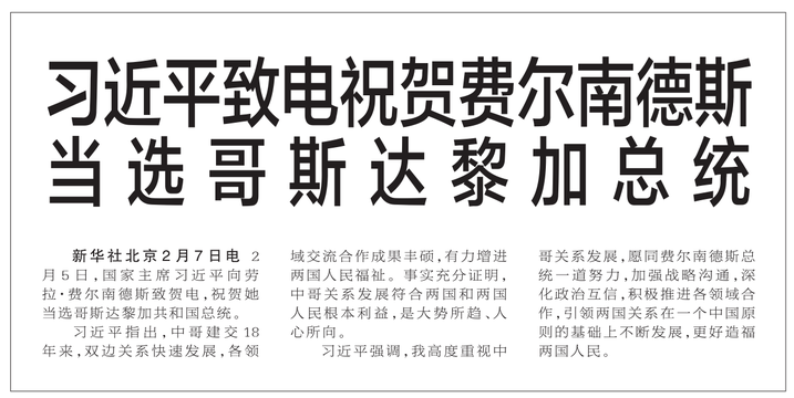 2月5日,国家主席习近平向劳拉·费尔南德斯致贺电,祝贺她当选哥斯达黎加共和国总统。