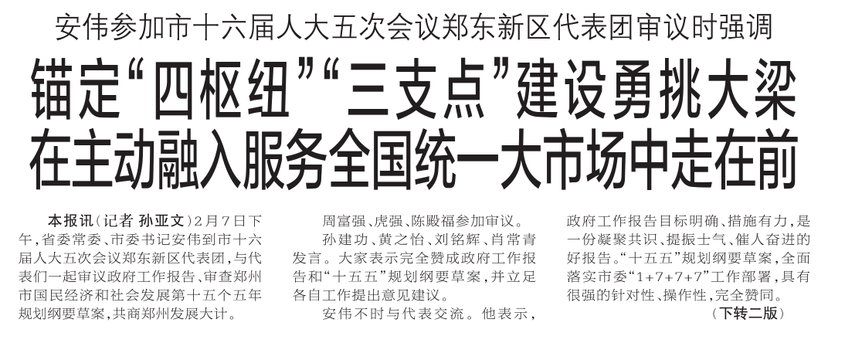 2月7日下午,省委常委、市委书记安伟到市十六届人大五次会议郑东新区代表团,与代表们一起审议政府工作报告、审查郑州市国民经济和社会发展第十五个五年规划纲要草案,共商郑州发展大计。(今日《郑州日报》1版、2版)