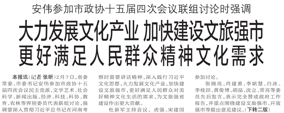 2月7日,省委常委、市委书记安伟参加市政协十五届四次会议民主党派、文学艺术、社会科学、新闻出版、经济、科技、科协、教育、农林等界别委员代表联组讨论,强调要深入贯彻习近平总书记在河南考察时重要讲话精神,深入践行习近平文化思想,大力发展文化产业,加快建设文旅强市,更好满足人民群众对美好精神文化生活的需求,为文旅强省建设作出更大贡献。(今日《郑州日报》1版、2版)