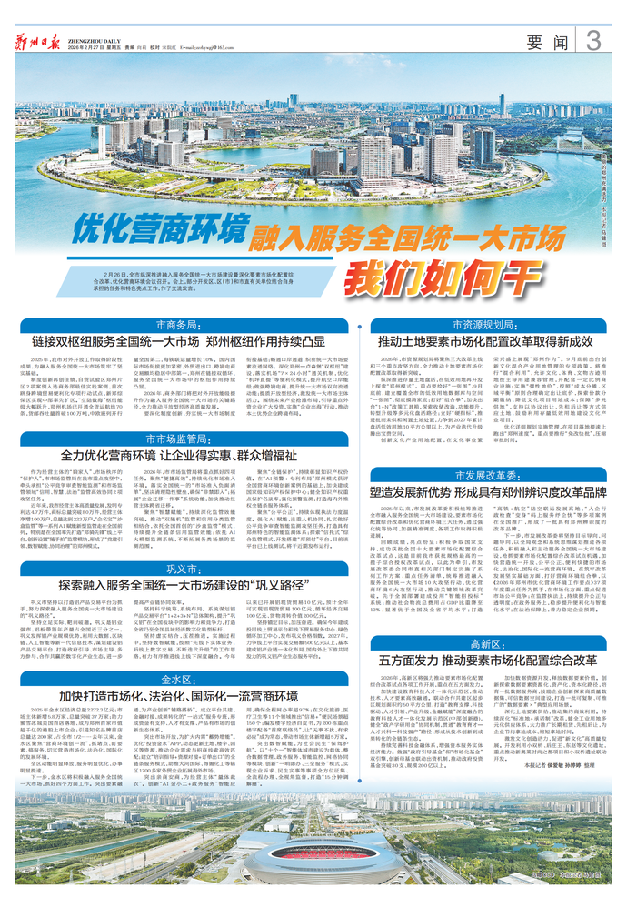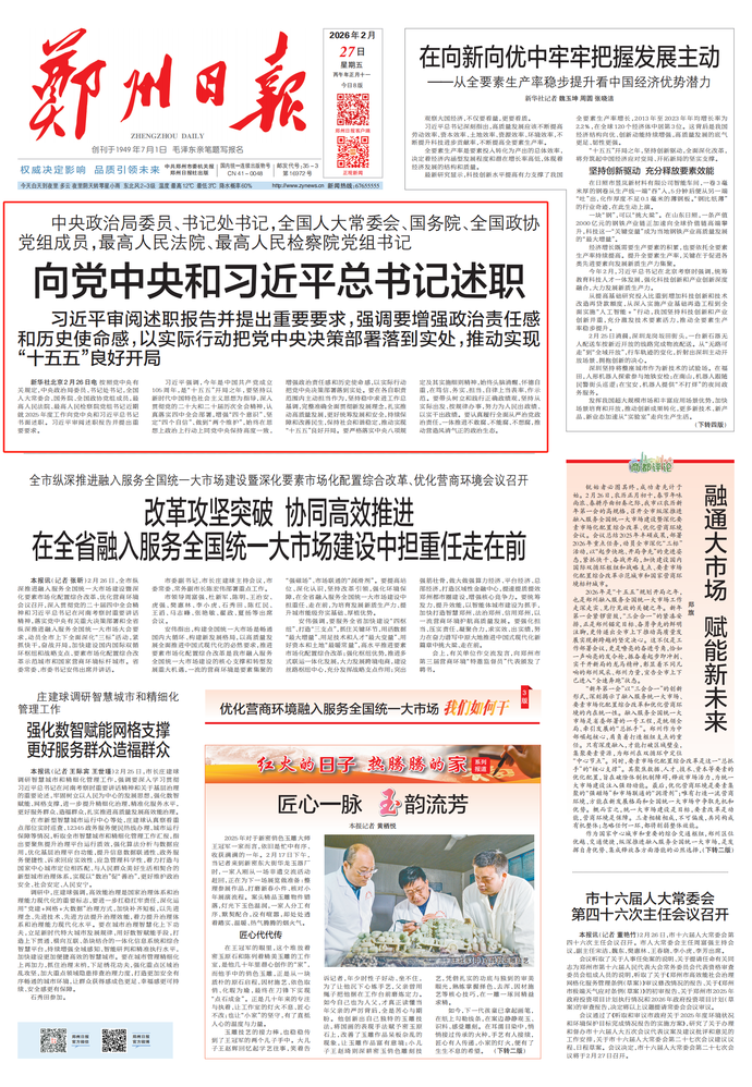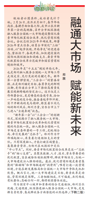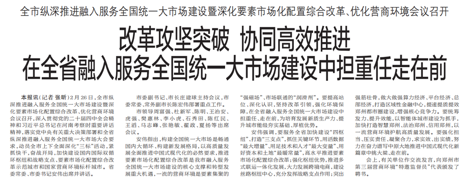 锐始者必图其终,成功者先计于始。2月26日,农历正月初十,春节年味尚浓、春耕序曲初奏之际,我市以农历新年第一会的高规格,召开全市纵深推进融入服务全国统一大市场建设暨深化要素市场化配置综合改革、优化营商环境会议。会议总结2025年丰硕成果,部署2026年重点任务,动员全市深化“三标”活动,以“起步快跑、开局争先”的竞进姿态,紧抓快干、奋战开局,加快建设国内国际双循环枢纽和战略支点、要素市场化配置综合改革示范城市和国家营商环境标杆城市。(今日《郑州日报》1版、2版)