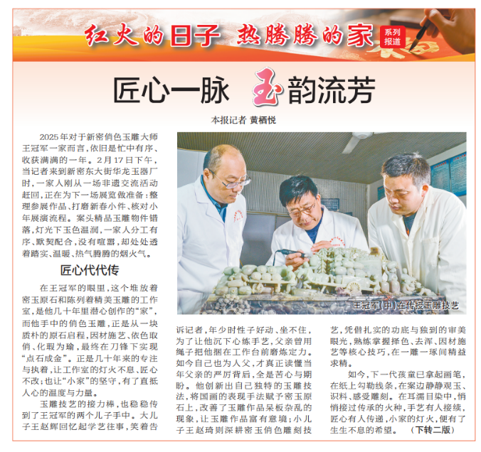 2025年对于新密俏色玉雕大师王冠军一家而言,依旧是忙中有序、收获满满的一年。2月17日下午,当记者来到新密东大街华龙玉器厂时,一家人刚从一场非遗交流活动赶回,正在为下一场展览做准备:整理参展作品、打磨新春小件、核对小年展演流程。案头精品玉雕物件错落,灯光下玉色温润,一家人分工有序、默契配合,没有喧嚣,却处处透着踏实、温暖、热气腾腾的烟火气。(今日《郑州日报》1版、2版)