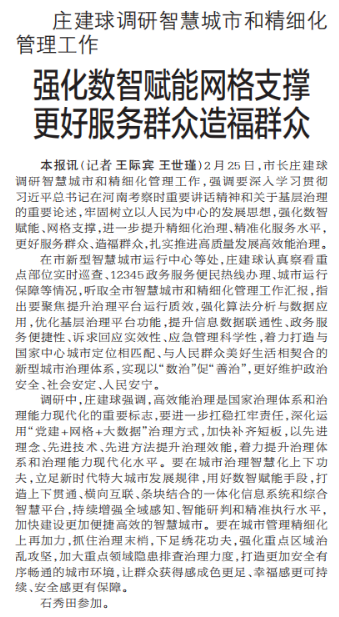 2月25日,市长庄建球调研智慧城市和精细化管理工作,强调要深入学习贯彻习近平总书记在河南考察时重要讲话精神和关于基层治理的重要论述,牢固树立以人民为中心的发展思想,强化数智赋能、网格支撑,进一步提升精细化治理、精准化服务水平,更好服务群众、造福群众,扎实推进高质量发展高效能治理。(今日《郑州日报》1版)