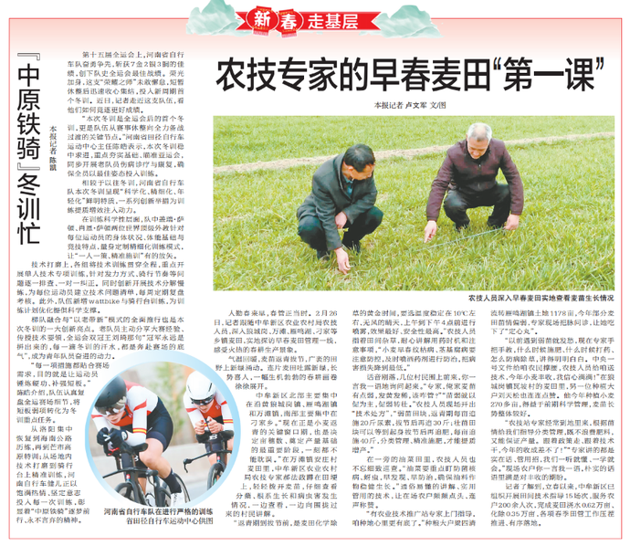 人勤春来早,春管正当时。2月26日,记者跟随中牟新区农业农村局农技人员,深入狼城岗、万滩、雁鸣湖、刁家等乡镇麦田,实地探访早春麦田管理一线,感受火热的春耕生产景象。(今日《郑州日报》2版)