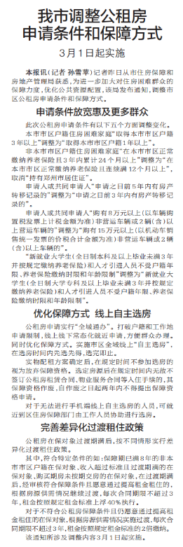 记者昨日从市住房保障和房地产管理局获悉,为进一步加大对住房困难群众的保障力度,优化公共资源配置,该局发布通知,调整市区公租房申请条件和保障方式。(今日《郑州日报》2版)