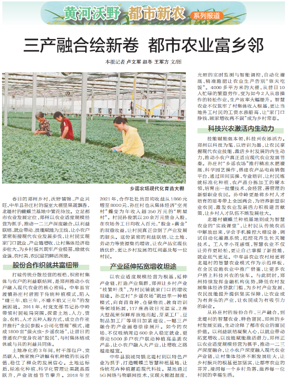 春日的郑州乡村,沃野铺锦、产业兴旺,中牟县孙庄村的温室大棚里果蔬飘香,北堤村的蝴蝶兰基地中繁花待放。立足都市农业发展定位,郑州以农业适度规模经营为抓手,推动一二三产深度融合,以利益联结、就业带动、技能赋能为主线,让小农户紧密衔接现代农业发展步伐,让村民实现家门口就业、产业链增收,让村集体经济稳步壮大,为乡村振兴筑牢产业根基,绘就农业强、农村美、农民富的鲜活图景。(今日《郑州日报》2版)
