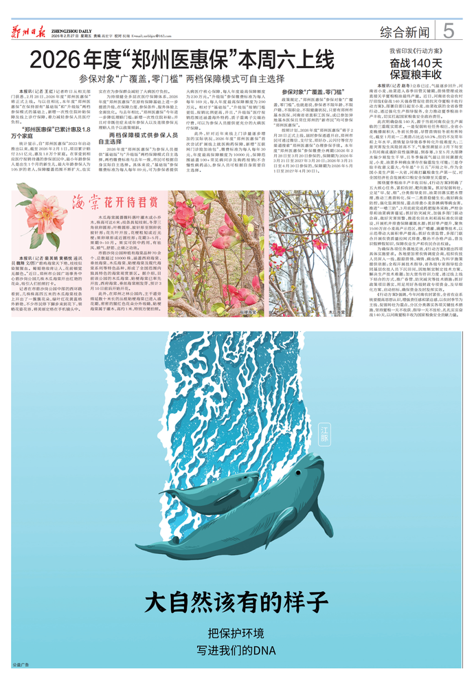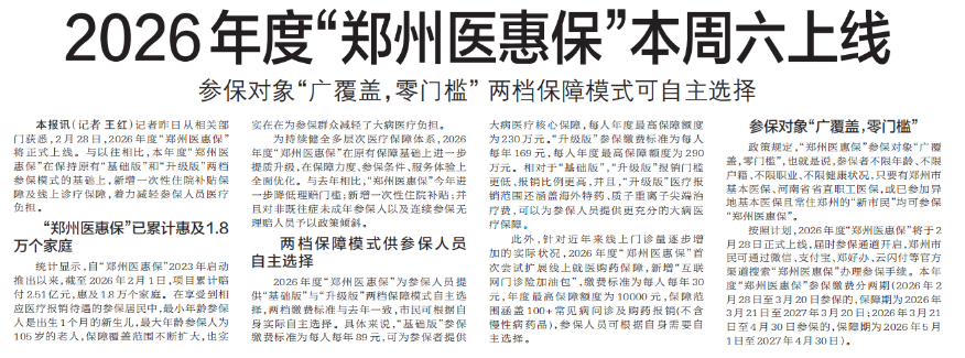 记者昨日从相关部门获悉,2月28日,2026年度“郑州医惠保”将正式上线。与以往相比,本年度“郑州医惠保”在保持原有“基础版”和“升级版”两档参保模式的基础上,新增一次性住院补贴保障及线上诊疗保障,着力减轻参保人员医疗负担。(今日《郑州日报》5版)