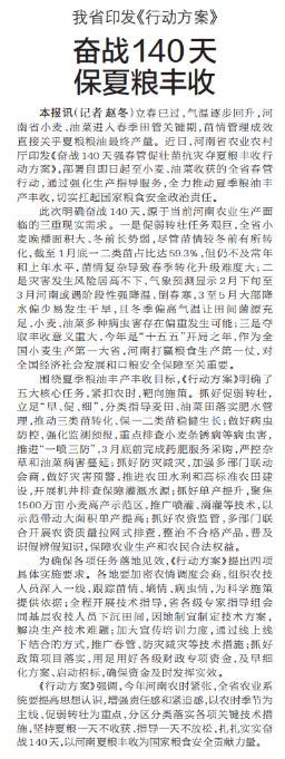 立春已过,气温逐步回升,河南省小麦、油菜进入春季田管关键期,苗情管理成效直接关乎夏粮粮油最终产量。近日,河南省农业农村厅印发《奋战140天强春管促壮苗抗灾夺夏粮丰收行动方案》,部署自即日起至小麦、油菜收获的全省春管行动,通过强化生产指导服务,全力推动夏季粮油丰产丰收,切实扛起国家粮食安全政治责任。(今日《郑州日报》5版)