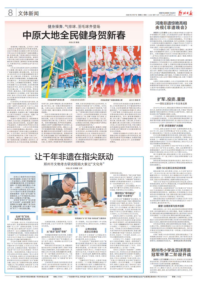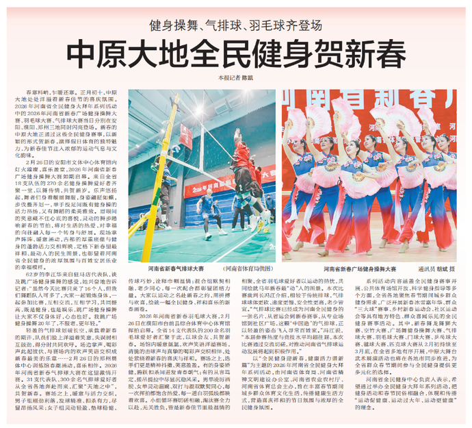 春寒料峭,乍暖还寒。正月初十,中原大地处处洋溢着新春佳节的喜庆氛围。2026年河南省全民健身大拜年系列活动中的2026年河南省新春广场健身操舞大赛、羽毛球大赛、气排球大赛当日分别在安阳、濮阳、郑州三地同时闪亮登场。新春的中原大地正通过这些全民健身赛事,以新颖的形式贺新春,演绎假日体育的独特魅力,为新春佳节注入浓郁的运动气息与文化韵味。(今日《郑州日报》8版)