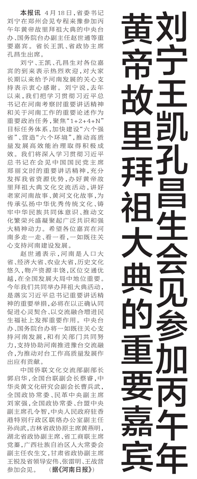 4月18日,省委书记刘宁在郑州会见专程来豫参加丙午年黄帝故里拜祖大典的中央台办、国务院台办副主任赵世通等重要嘉宾。省长王凯、省政协主席孔昌生出席。