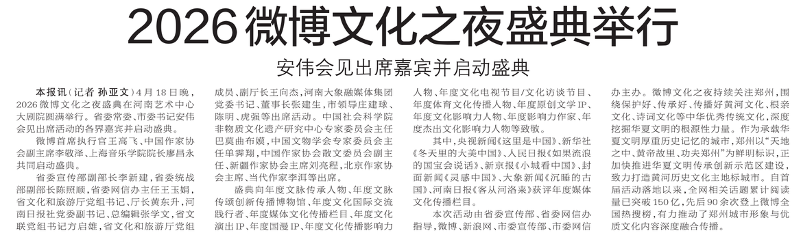 4月18日晚,2026微博文化之夜盛典在河南艺术中心大剧院圆满举行。省委常委、市委书记安伟会见出席活动的各界嘉宾并启动盛典。