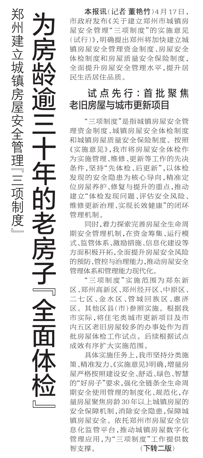 4月17日,市政府发布《关于建立郑州市城镇房屋安全管理“三项制度”的实施意见(试行)》,明确提出郑州将加快建立城镇房屋安全管理资金制度、房屋安全体检制度和房屋质量安全保险制度,全面提升房屋安全管理水平,提升居民生活居住品质。(今日《郑州日报》1版、2版)