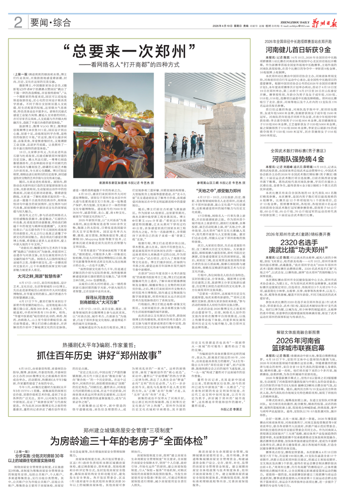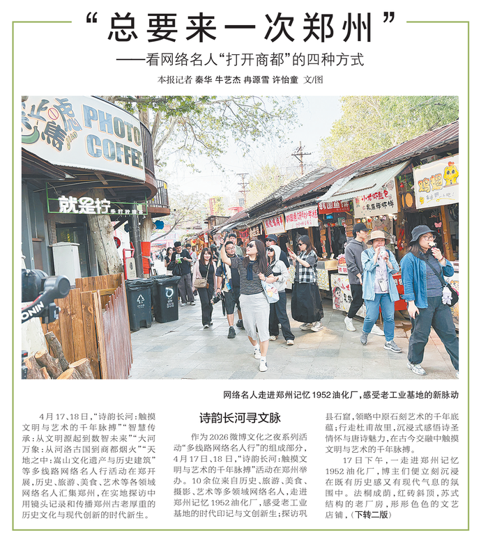 4月17、18日,“诗韵长河:触摸文明与艺术的千年脉搏”“智慧传承:从文明源起到数智未来”“大河万象:从河洛古国到商都烟火”“天地之中:嵩山文化遗产与历史建筑”等多线路网络名人行活动在郑开展,历史、旅游、美食、艺术等各领域网络名人汇集郑州,在实地探访中用镜头记录和传播郑州古老厚重的历史文化与现代创新的时代新生。(今日《郑州日报》1版、2版)