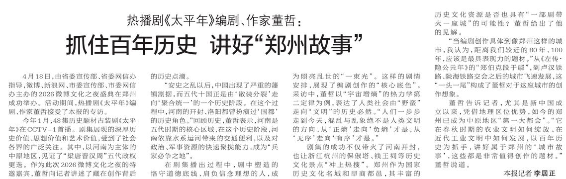 4月18日,由省委宣传部、省委网信办指导,微博、新浪网、市委宣传部、市委网信办主办的2026微博文化之夜盛典在郑州成功举办。活动期间,热播剧《太平年》编剧、作家董哲接受了本报的专访。(今日《郑州日报》2版)