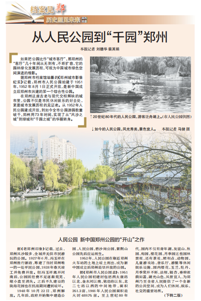 如果把公园比作“城市客厅”,那郑州的“客厅”几十年间从无到有,不断扩容,它的园林绿化发展历程,可视为中国城市绿色空间演进的缩影。(今日《郑州日报》1版、2版)