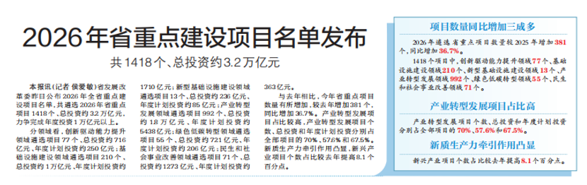 省发展改革委昨日公布2026年全省重点建设项目名单,共遴选2026年省重点项目1418个、总投资约3.2万亿元,力争完成年度投资1万亿元以上。(今日《郑州日报》1版)