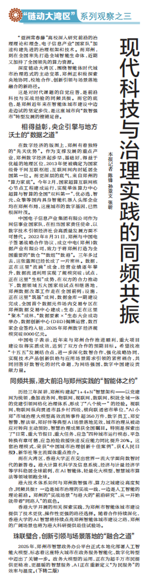 “亚洲常春藤”高校深入研究前沿的治理理论和理念,电子信息产业“国家队”加速构建先进的治理框架和技术。而郑州,则在全国率先打造全域智能生命体,近期又加持了全国领先的算力资源。(今日《郑州日报》1版、2版)
