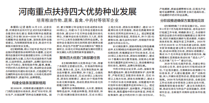 4月2日,记者获悉,河南省农业农村厅正式印发《开展种业全链条标准化建设 助推河南种业高质量发展工作方案(2026—2030 年)》,以标准化赋能种业高质量发展,加快推进种业强省建设,为保障国家粮食安全、推动乡村全面振兴提供坚实支撑。(今日《郑州日报》2版)