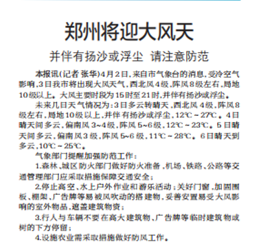 4月2日,来自市气象台的消息,受冷空气影响,3日我市将出现大风天气,西北风4级,阵风8级左右,局地10级以上。大风主要时段为15时至21时,并伴有扬沙或浮尘。(今日《郑州日报》2版)