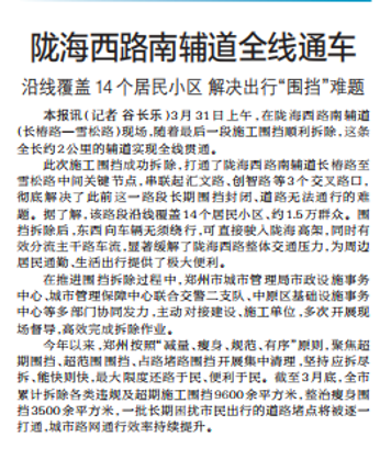 3月31日上午,在陇海西路南辅道(长椿路—雪松路)现场,随着最后一段施工围挡顺利拆除,这条全长约2公里的辅道实现全线贯通。(今日《郑州日报》2版)