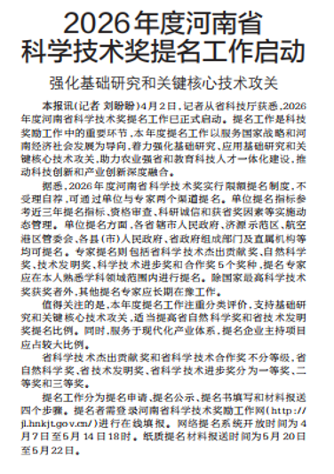 4月2日,记者从省科技厅获悉,2026年度河南省科学技术奖提名工作已正式启动。提名工作是科技奖励工作中的重要环节,本年度提名工作以服务国家战略和河南经济社会发展为导向,着力强化基础研究、应用基础研究和关键核心技术攻关,助力农业强省和教育科技人才一体化建设,推动科技创新和产业创新深度融合。(今日《郑州日报》2版)