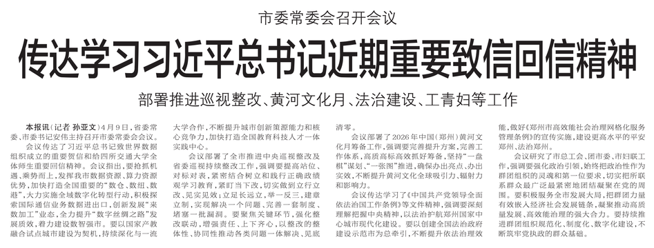 部署推进巡视整改、黄河文化月、法治建设、工青妇等工作